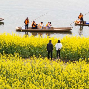 3月7日,在四川省成都邛崃市羊安街道两河村,游客乘船观赏油菜花。