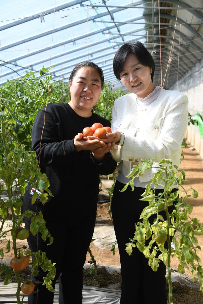 2月29日,在北京市平谷区东高村镇现代农业产业园,岳巧云(右)与她培养的电商直播达人王丽萍一起展示成熟的西红柿。