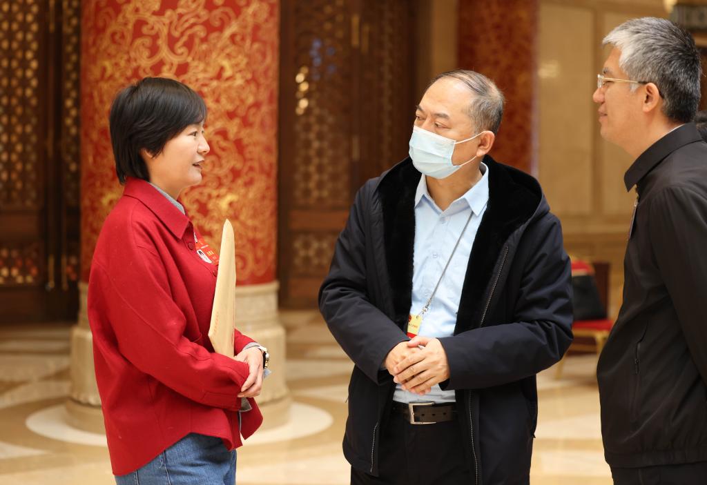 3月8日,岳巧云(左)在北京人民大会堂准备前往“代表通道”接受媒体采访。