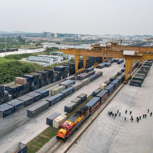3月8日,在南宁国际铁路港,电力铁塔专列准备发车。