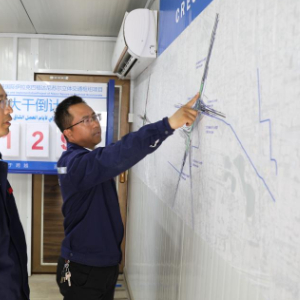 3月2日,中伊员工在伊拉克巴格达尼苏尔立体交通枢纽项目现场讨论施工进展。