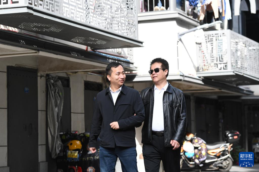 2月18日,王永澄代表(右)在志愿者的协助下前往福州市鼓楼区红墙巷小区调研盲人家庭子女入学及保障房入住情况。