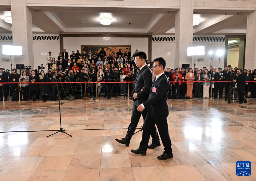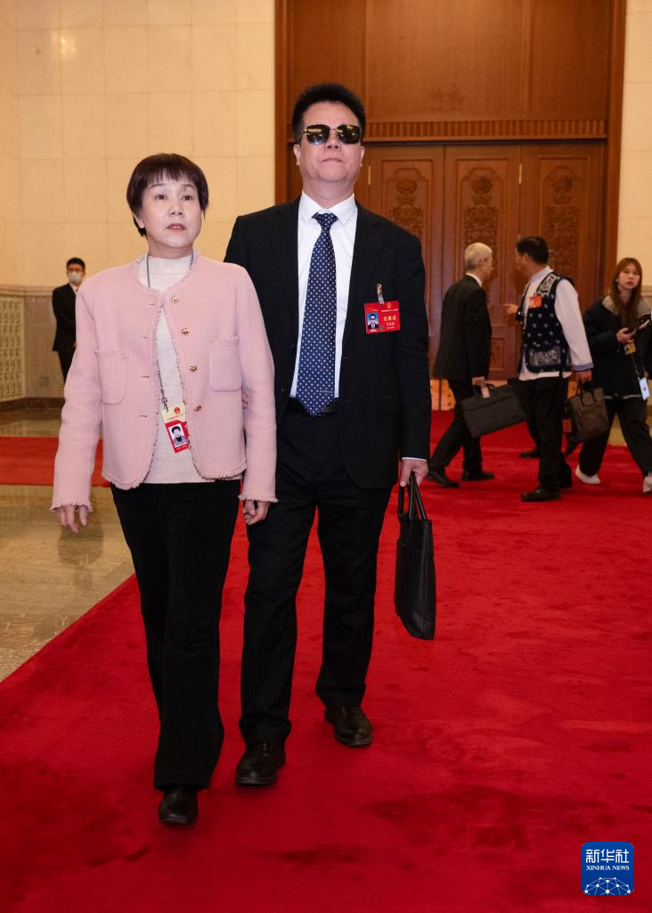 3月8日,在十四届全国人大二次会议第二场“代表通道”上,王永澄代表(前右)在工作人员的协助下前行,准备回答记者提问。