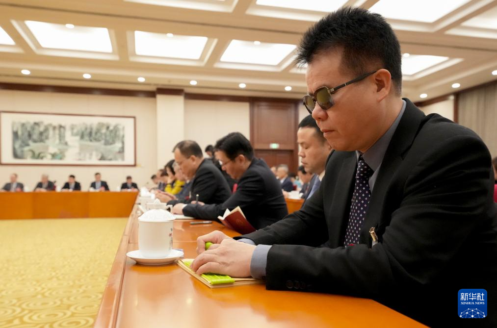 3月6日,王永澄代表(右一)在参加分组审议时用盲文记笔记。