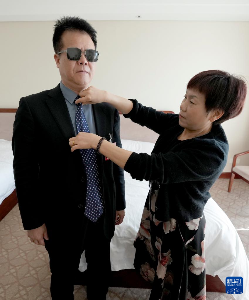 3月6日,在北京的驻地房间内,王永澄代表(左)的妻子周检发为他整理仪容,为参加会议做准备。