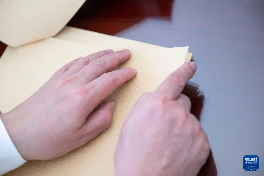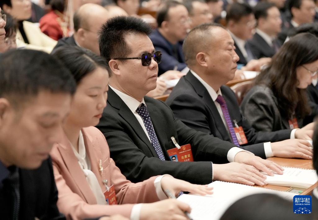 3月5日,在十四届全国人大二次会议开幕会上,王永澄代表用手指阅读盲文版的政府工作报告。