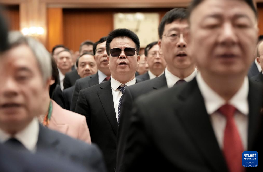 3月5日,王永澄代表(中)在十四届全国人大二次会议开幕会上唱国歌。