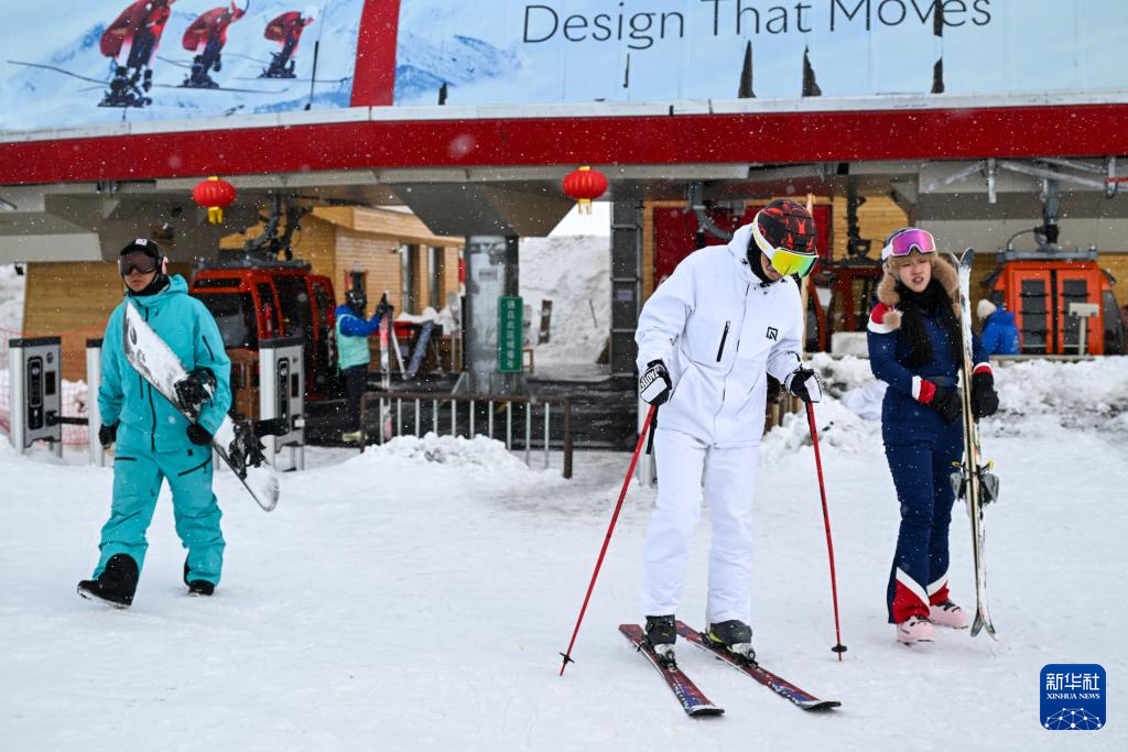 3月8日,游客在位于禾木村的吉克普林国际滑雪度假区准备滑雪。