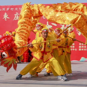 3月9日,民间艺人在山东枣庄滕州市龙泉文化广场表演舞龙。
