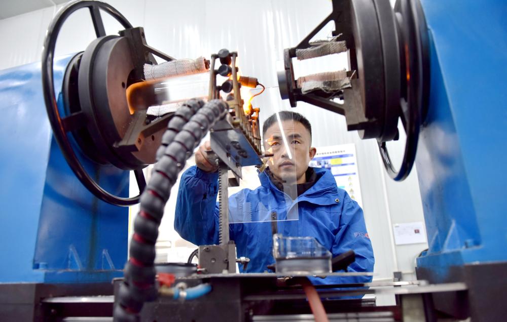 3月11日,工人在威县一家新能源科技企业高温集热管生产线上工作。