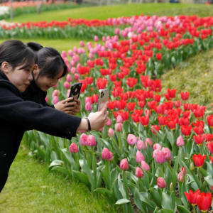 3月11日,两名游客在杭州太子湾公园拍摄郁金香。