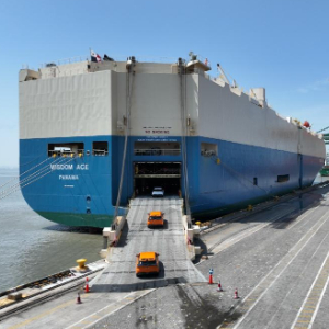 3月12日,上汽集团乘用车福建宁德基地生产的车辆从福州港江阴港区码头驶上远洋滚装轮。