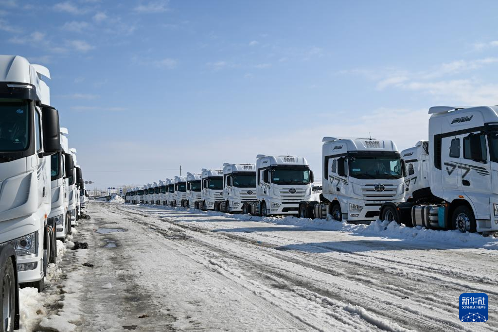 3月11日,新疆吉木乃口岸停放着等待出口的国产汽车。