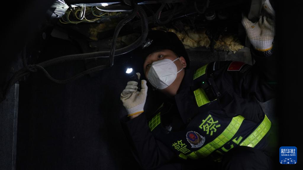 3月11日,在新疆吉木乃口岸,民警在检查出境车辆底盘。