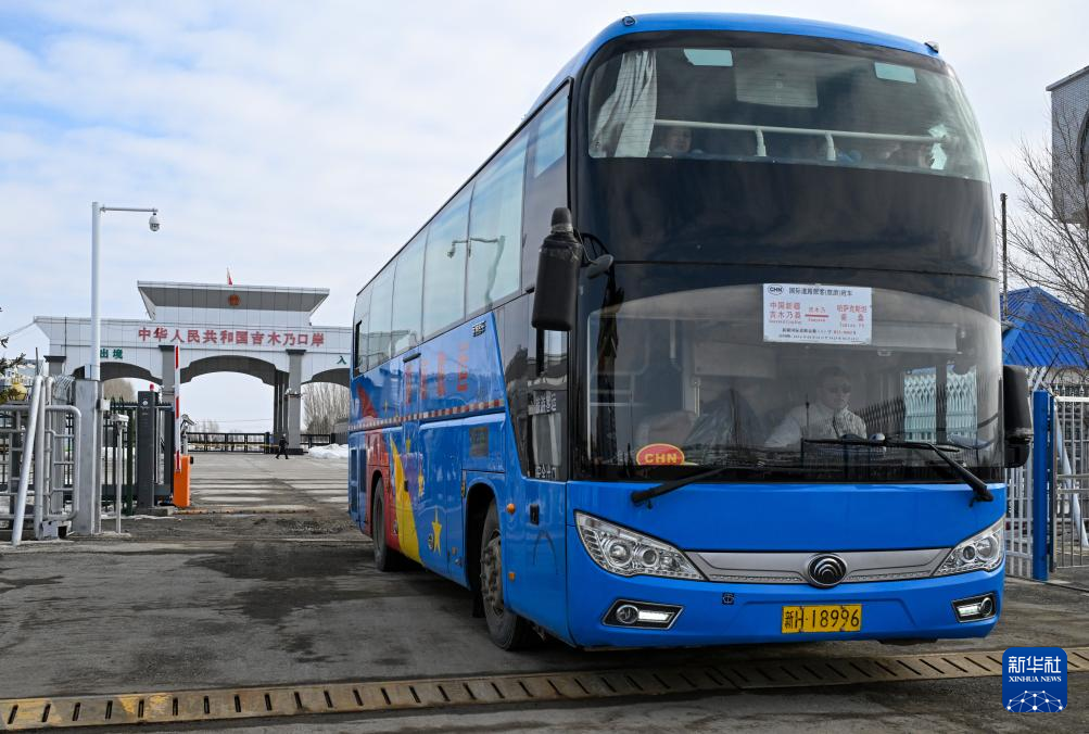 3月11日,一辆大巴车驶出新疆吉木乃口岸。