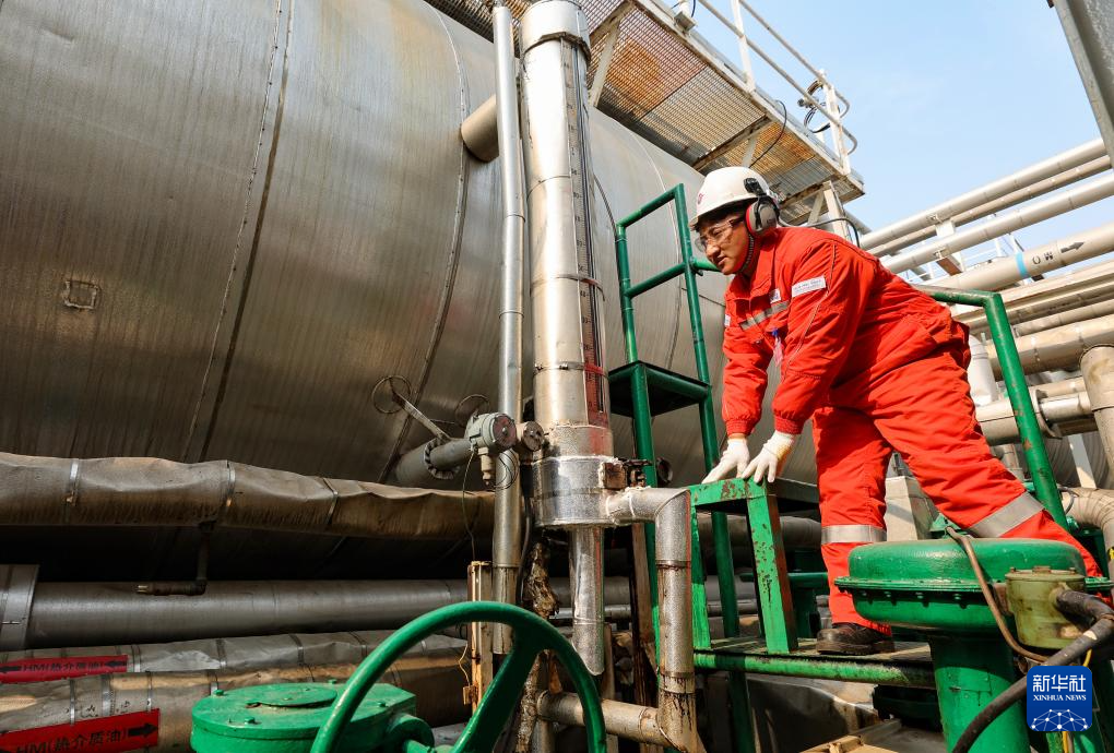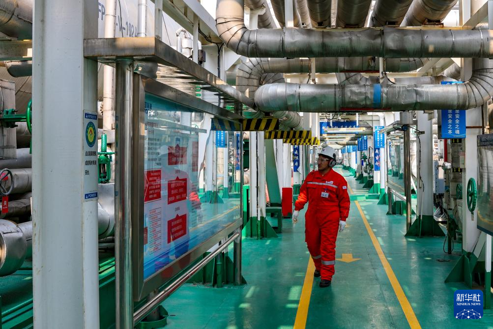 强巴在秦皇岛32-6油田“渤海世纪号”(FPSO)16万吨级浮式生产储油装置上观察设备运转情况(3月7日摄)。