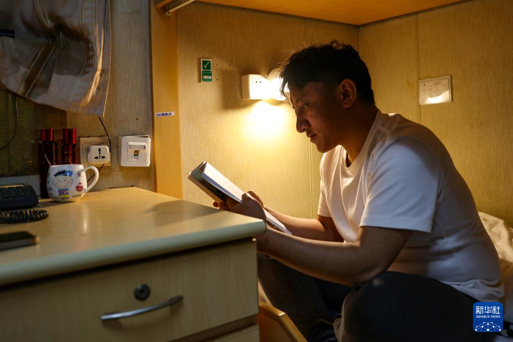 强巴在秦皇岛32-6油田“渤海世纪号”(FPSO)16万吨级浮式生产储油装置上休班的时候进行业务学习(3月7日摄)。现在他正准备中级操作工资格的考试。