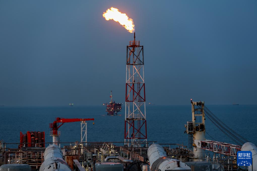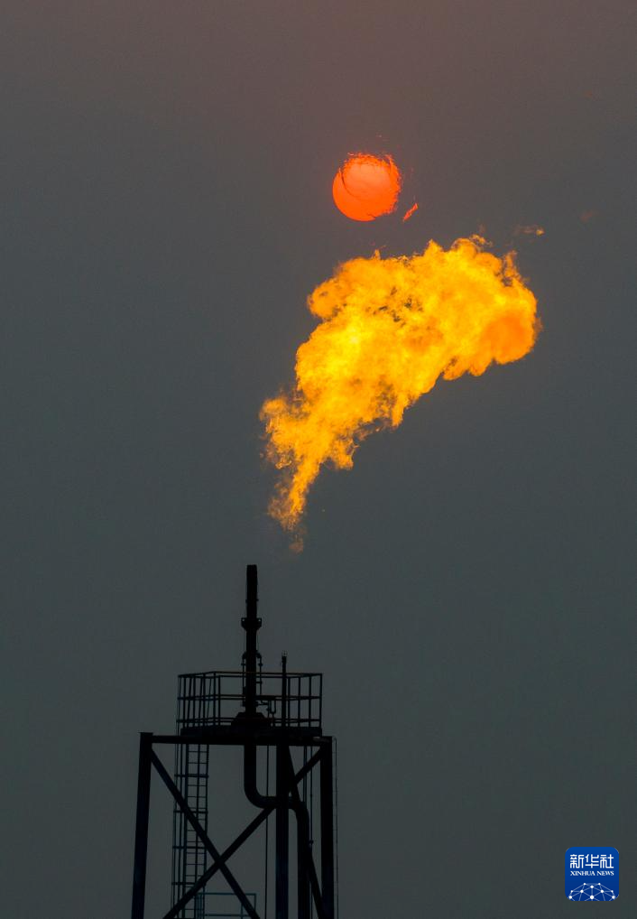 夕阳下的秦皇岛32-6油田“渤海世纪号”(FPSO)16万吨级浮式生产储油装置的火炬(无人机照片,3月7日摄)。