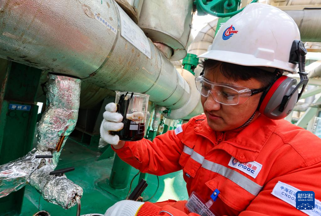 强巴在秦皇岛32-6油田“渤海世纪号”(FPSO)16万吨级浮式生产储油装置上检查原油油样(3月7日摄)。