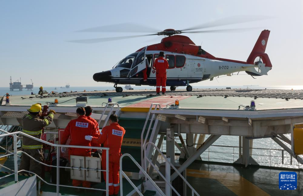 直升机在秦皇岛32-6油田“渤海世纪号”(FPSO)16万吨级浮式生产储油装置上降落(3月7日摄)。这是海上石油工人经常使用的交通工具。