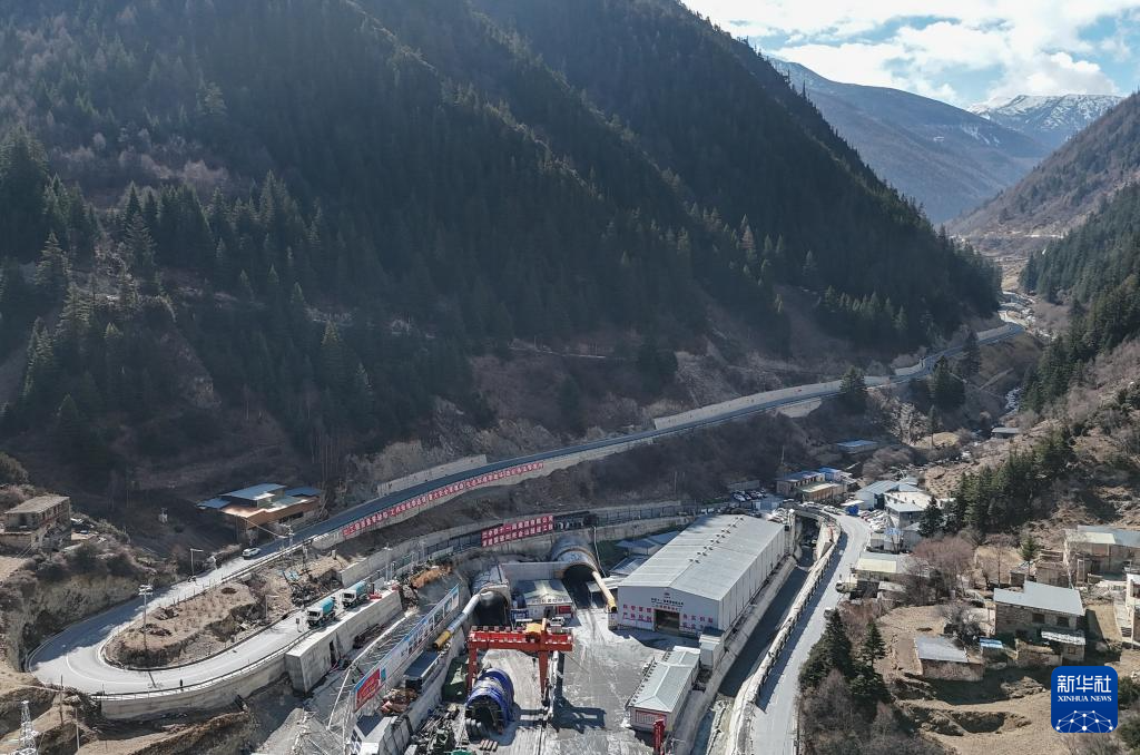 这是3月13日在四川省阿坝藏族羌族自治州小金县拍摄的国道351夹金山隧道口(无人机照片)。
