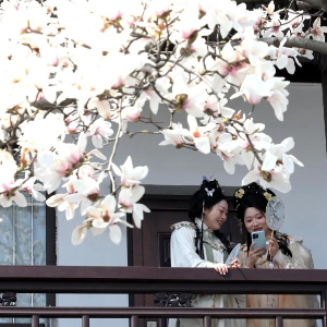 3月13日,山东省济南市大明湖公园玉兰花开,吸引游客前来观赏游玩。