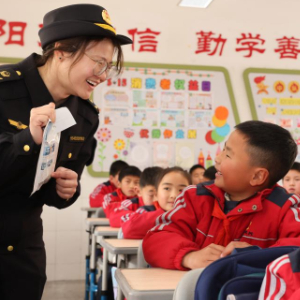 3月13日,在浙江省湖州市德清县乾元镇中心小学,市场监管执法人员向学生们传授如何辨识消费品。