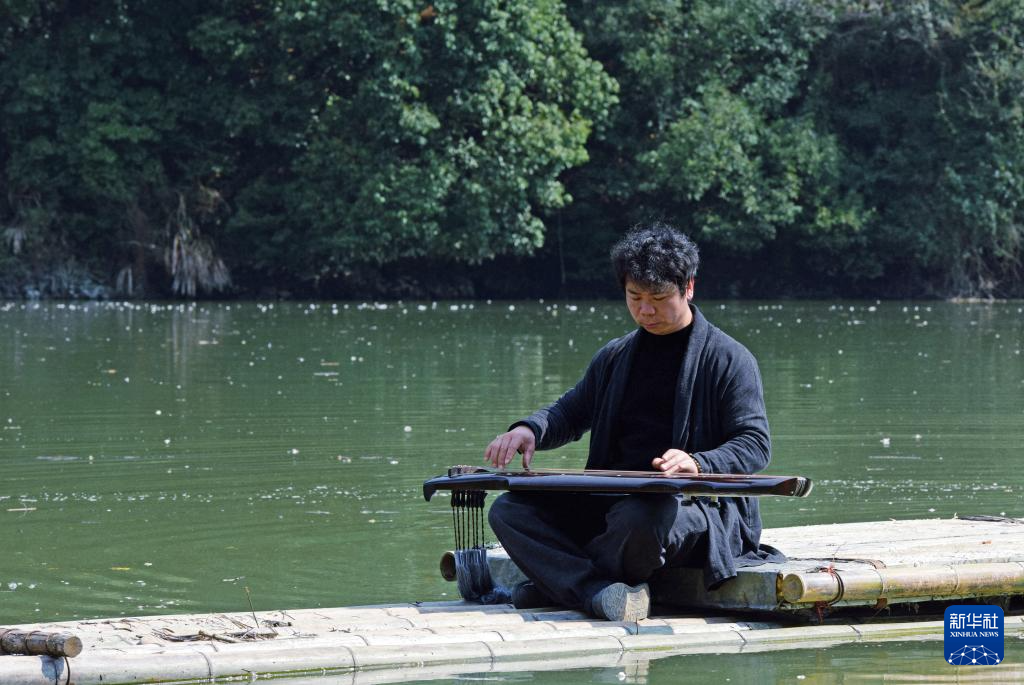 封益华在位于江西省宜黄县的一处水库抚琴(2023年2月18日摄)。