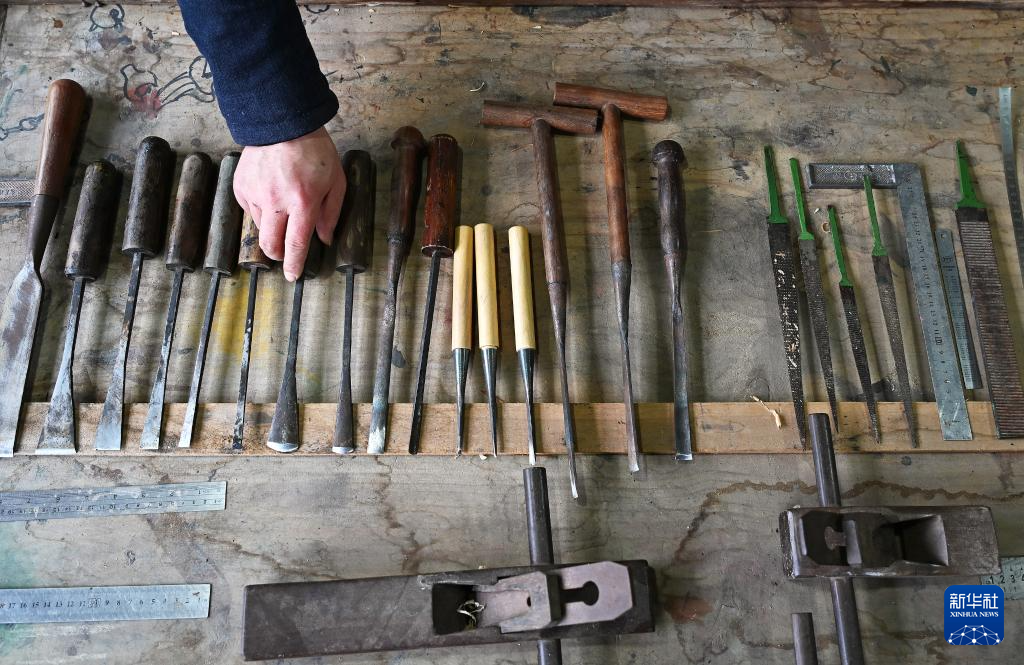 在位于江西省宜黄县的古琴工作室,封益华在挑选制琴工具(3月7日摄)。