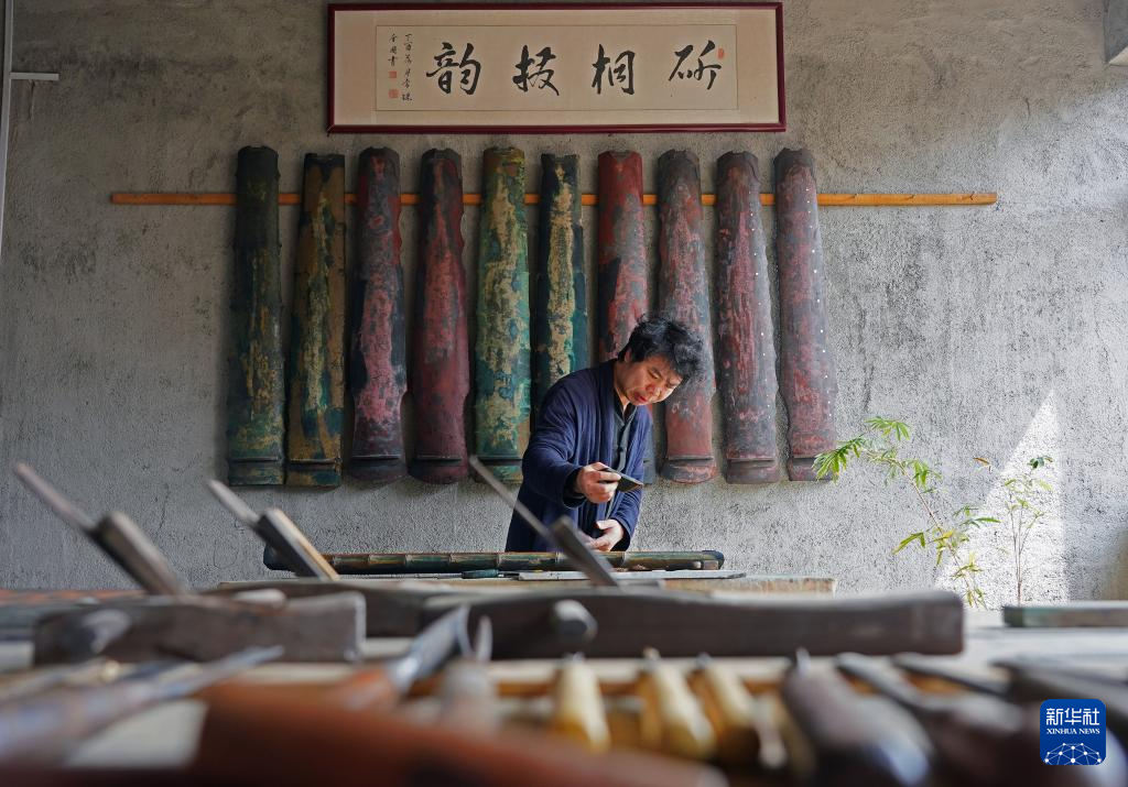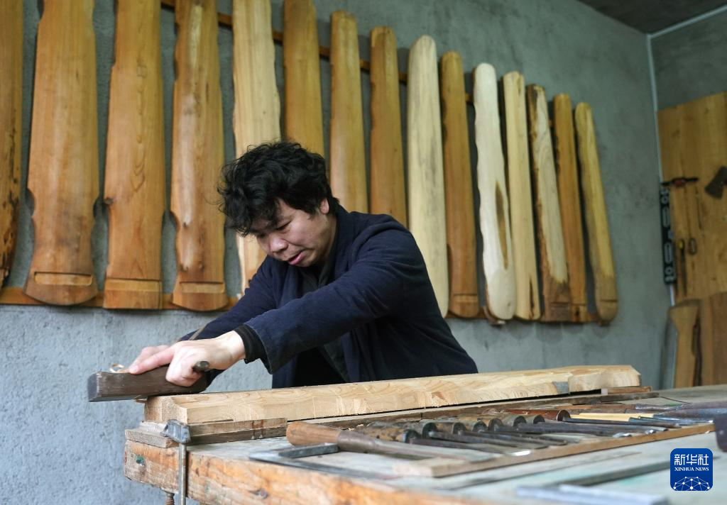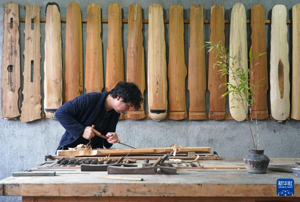 在位于江西省宜黄县的古琴工作室,封益华在制作古琴(3月7日摄)。