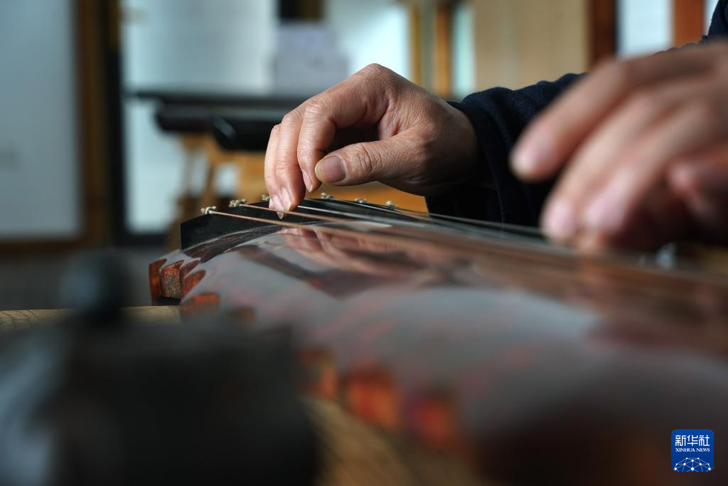 封益华在位于江西省宜黄县的琴馆里抚琴(2月20日摄)。