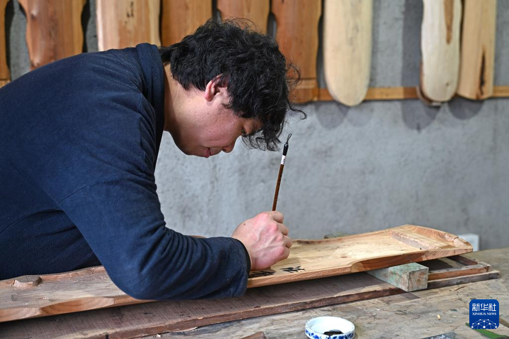 在位于江西省宜黄县的古琴工作室,封益华在琴坯上题款(3月7日摄)。