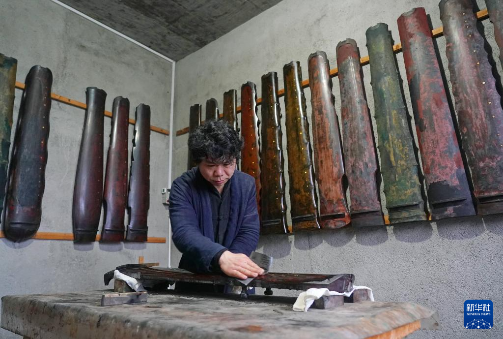 在位于江西省宜黄县的古琴工作室,封益华在给古琴上漆(3月8日摄)。