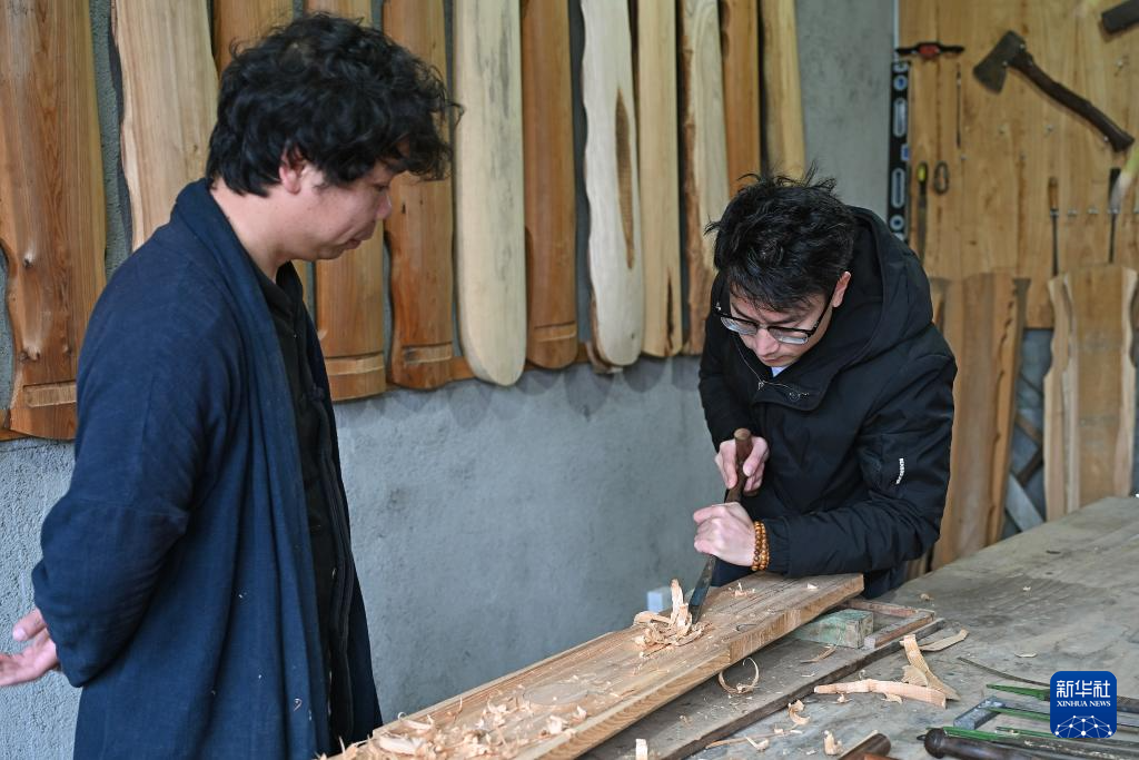 在位于江西省宜黄县的古琴工作室,封益华(左)指导徒弟制琴(3月7日摄)。