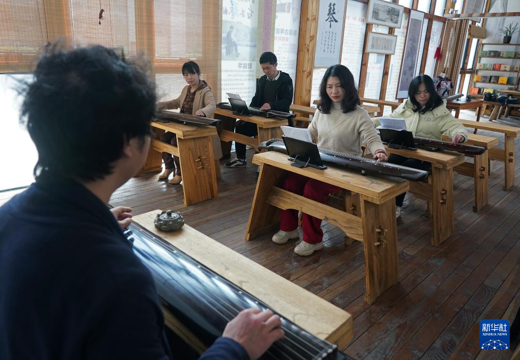 在位于江西省宜黄县的琴馆里,封益华(左一)给古琴爱好者传授演奏技艺(3月8日摄)。
