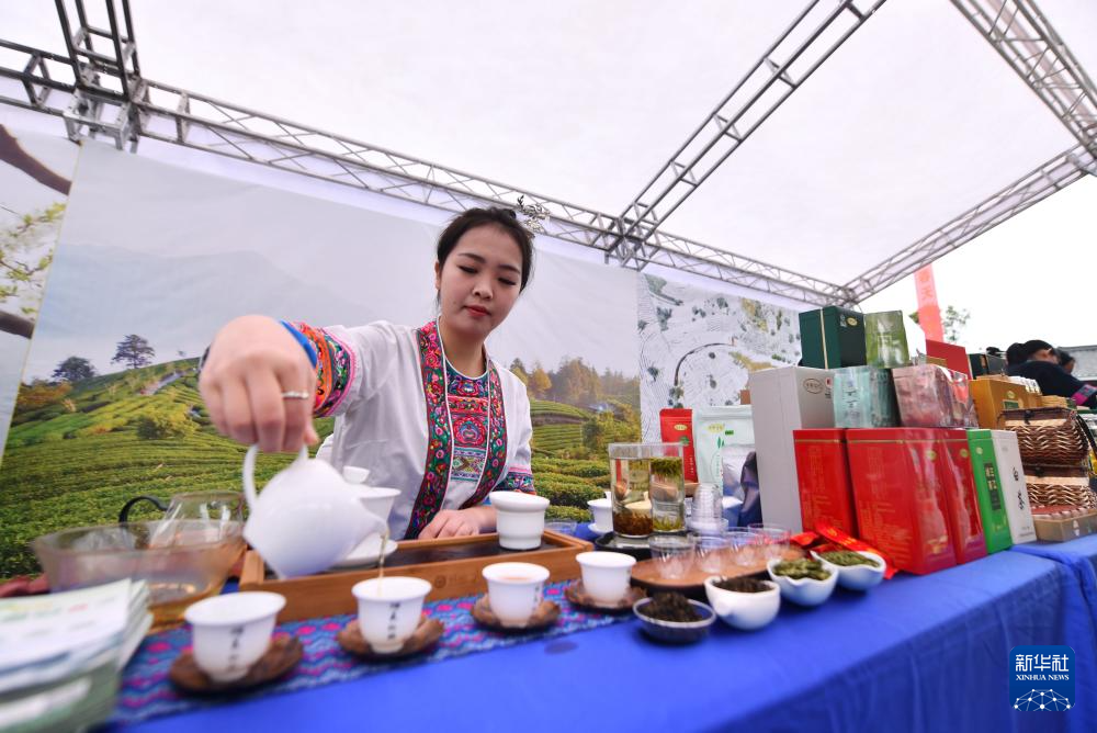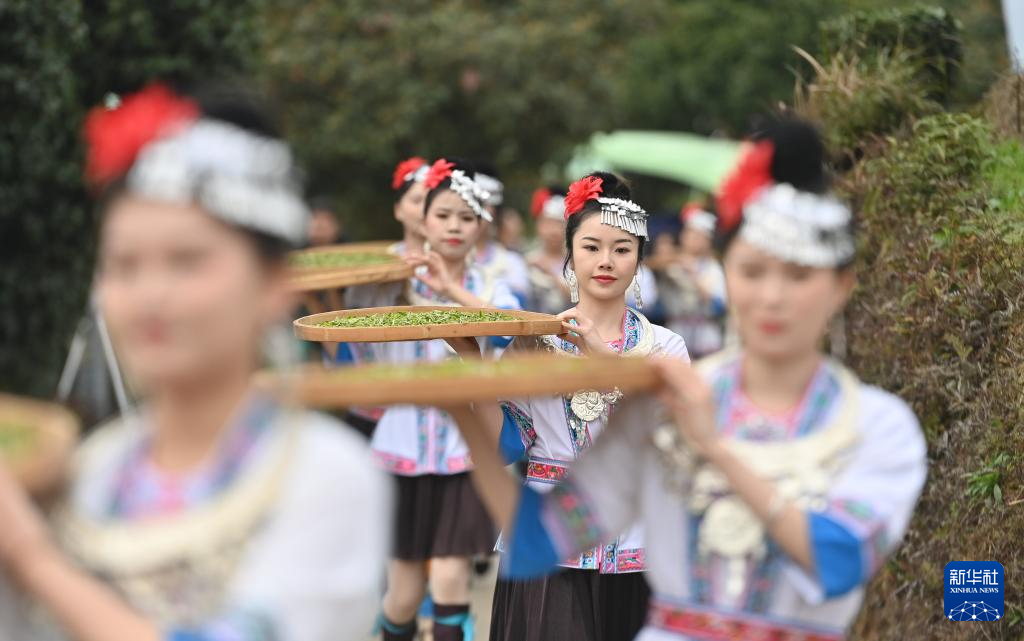 3月14日,在柳州市三江侗族自治县八江镇布央村,村民在展示茶艺。