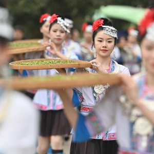 3月14日,在柳州市三江侗族自治县八江镇布央村,侗族姑娘在展示三江早春茶新芽。