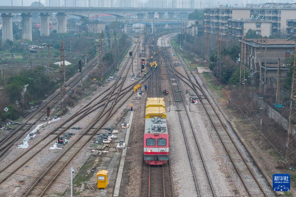3月14日,在沪昆铁路湘潭东至十里冲区间,铁路工人使用轨检仪检查新装轨道。