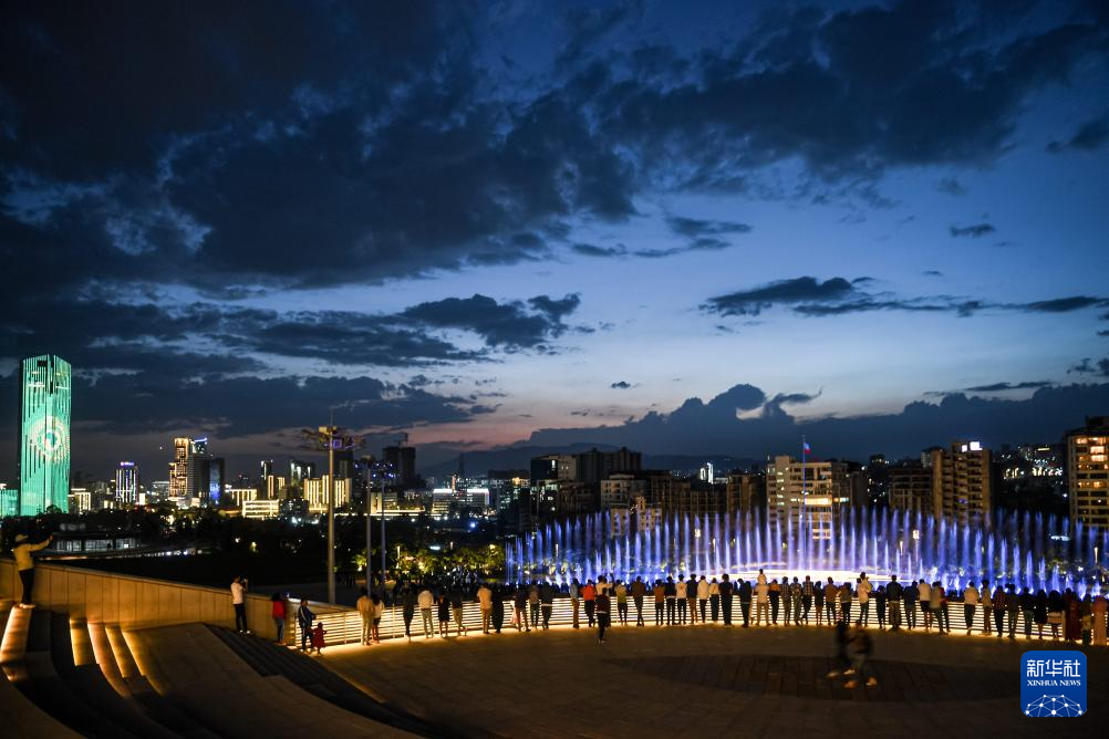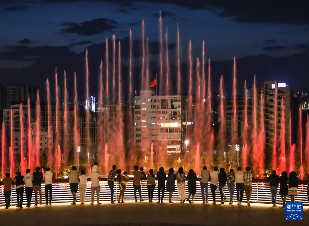 这是2月18日在埃塞俄比亚首都亚的斯亚贝巴友谊广场拍摄的音乐喷泉和光影秀。