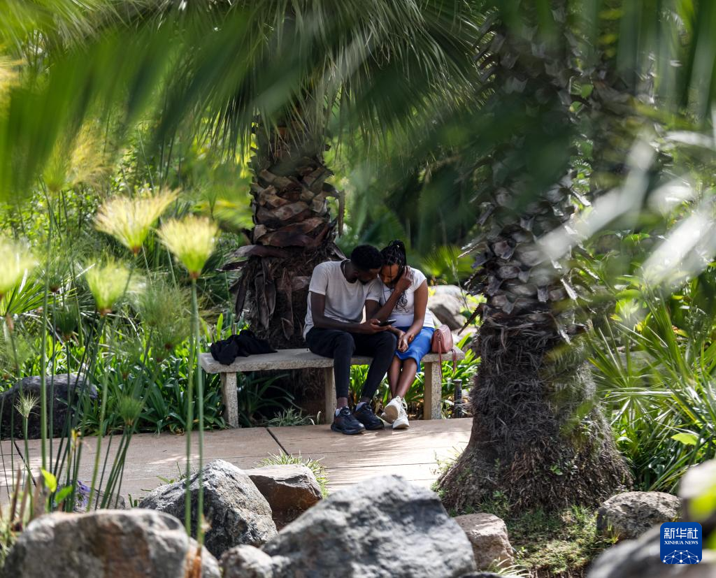 2月18日,在埃塞俄比亚首都亚的斯亚贝巴,游人在友谊广场树荫下乘凉。