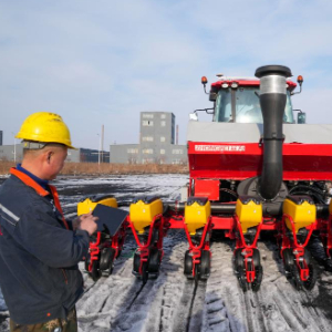 3月13日,在黑龙江省众为农机有限公司后院,工作人员测试一款高速气吹电驱播种机。
