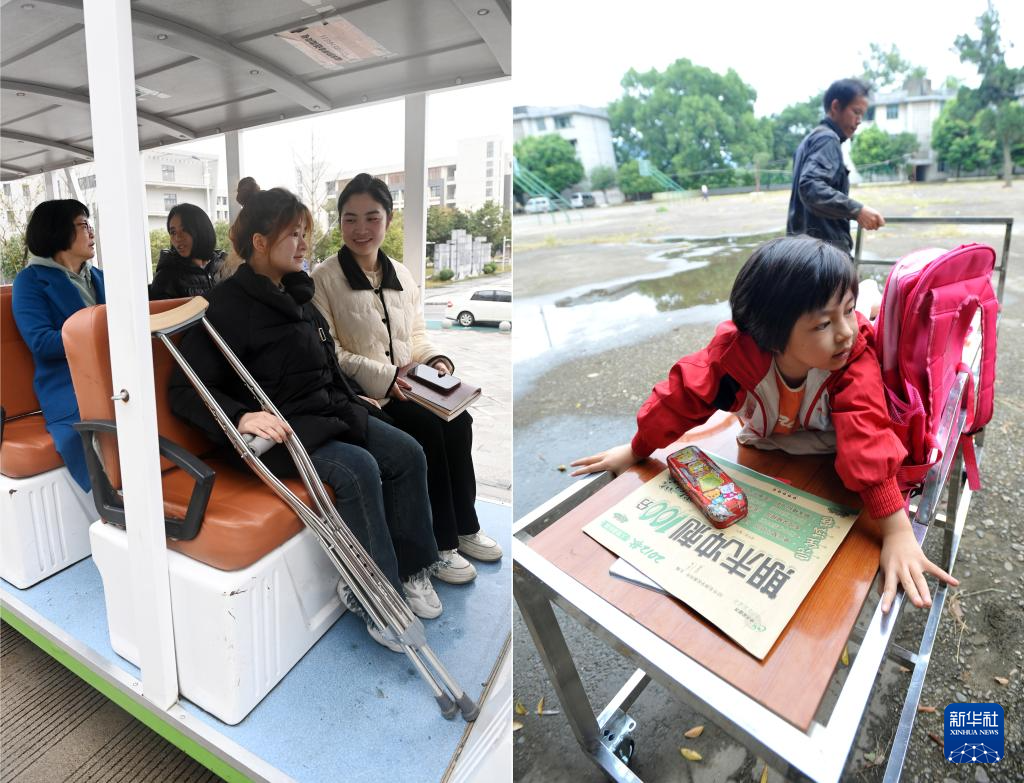 这是一张拼版照片,左图为:在广西桂林师范高等专科学校,董倩(前排左一)课后坐着校园摆渡车去饭堂吃饭(2024年3月13日摄)。右图为:在广西灵川县灵川镇的三叉尾小学,董倩的父亲董慧玲课后拉着可以移动的床将她带回宿舍吃饭(2012年9月13日摄)。