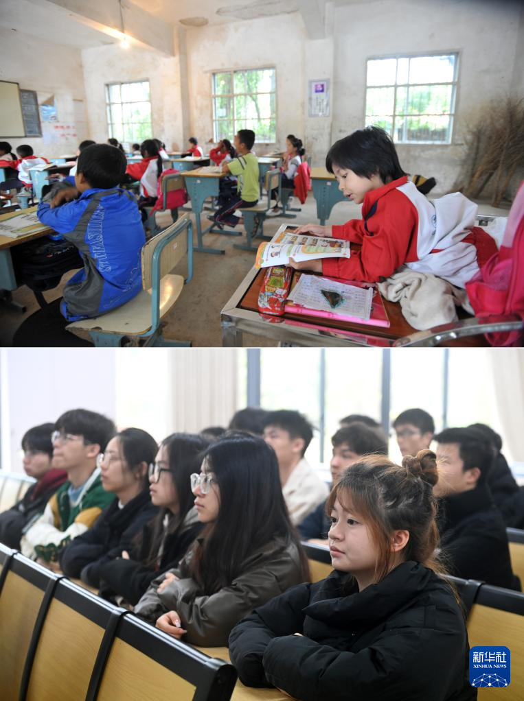 这是一张拼版照片,上图为:在广西灵川县灵川镇的三叉尾小学,董倩(右二)课间和同学在一起(2012年9月13日摄)。下图为:在广西桂林师范高等专科学校,董倩(二排右一)课间和同学聊天(2024年3月13日摄)。
