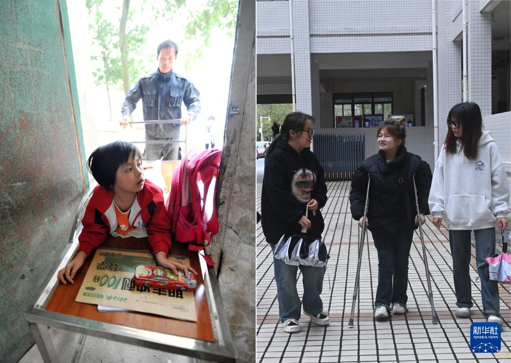 这是一张拼版照片,左图为:在广西灵川县灵川镇的三叉尾小学,董倩的父亲董慧玲课后拉着可以移动的床将她带出教室(2012年9月13日摄)。右图为:在广西桂林师范高等专科学校,董倩(中)课后和同学走在教室外(2024年3月13日摄)。