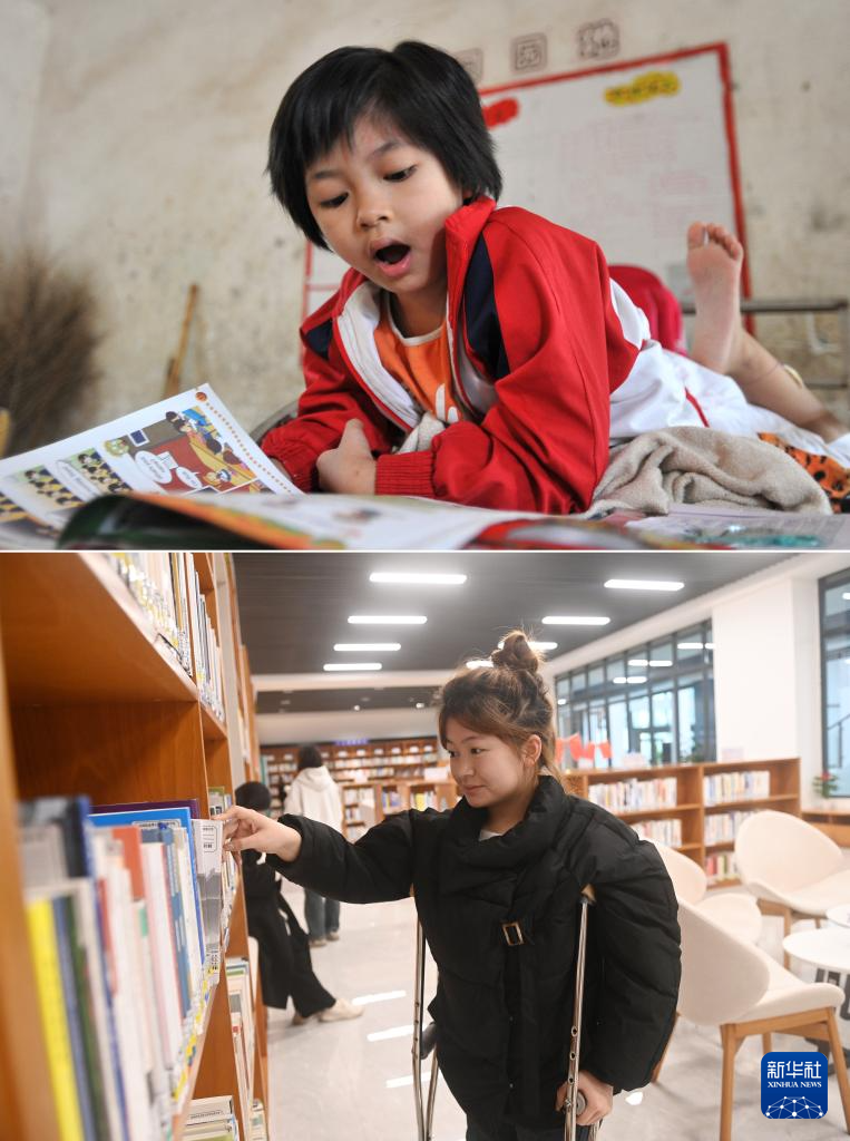 这是一张拼版照片,左图为:在广西灵川县灵川镇的三叉尾小学,董倩趴在床上学习(2012年9月13日摄)。右图为:在广西桂林师范高等专科学校,董倩(右)在图书馆通过电子设备查找书籍(2024年3月13日摄)。