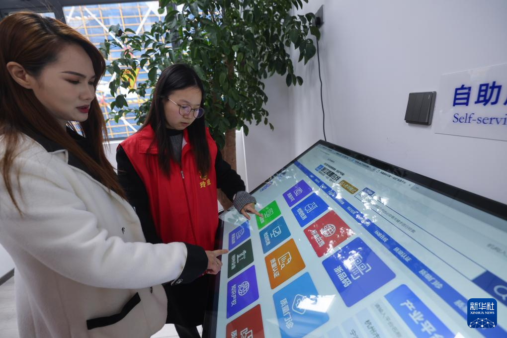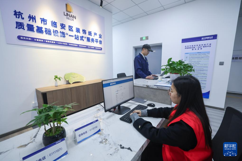 3月14日,在杭州市临安区装饰纸产业质量基础设施“一站式”服务平台前,工作人员为相关企业办理业务。