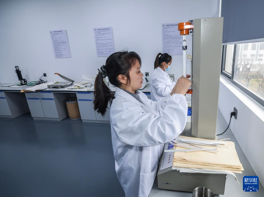 3月14日,在杭州市临安区装饰纸产业质量基础设施“一站式”服务平台的实验室内,工作人员检测相关企业的装饰纸样品。