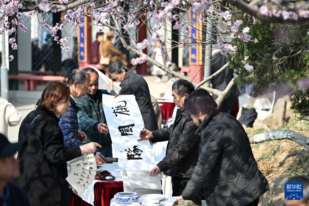 3月15日,游人在天津桃花堤欣赏书法作品。