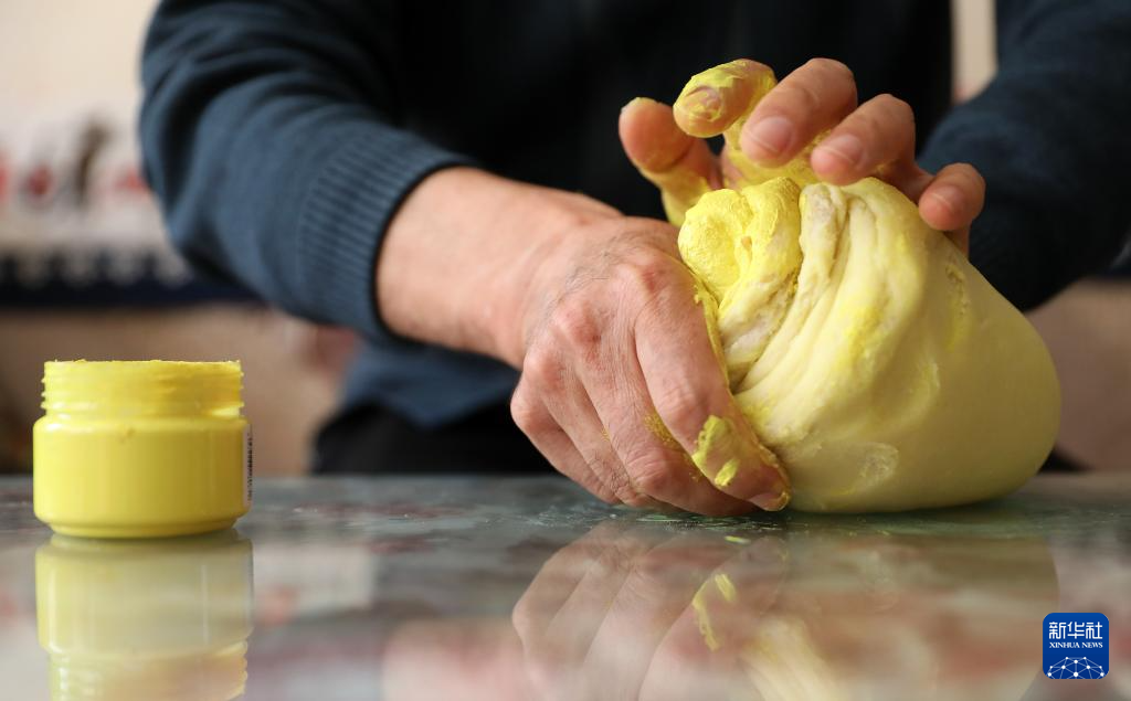 3月13日,陈群厚在自己家用颜料和面,准备为学生上课使用的面料。