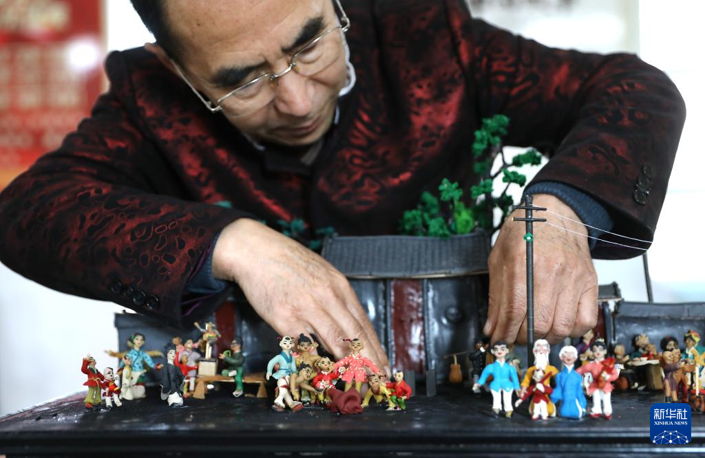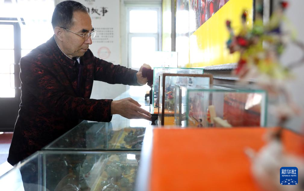 3月13日,陈群厚在营口辽河老街的工作室内整理展出的面塑作品。
